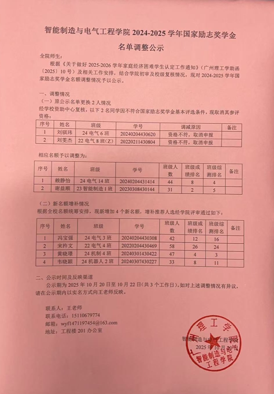 根据《关于做好2025-2026学年家庭经济困难学生认定工作通知》(广州理工学助函〔2025〕10号)及相关工作安排,结合学院初审及校级复核情况,现对2024-2025学年国家励志奖学金名额调整情况予以公示。