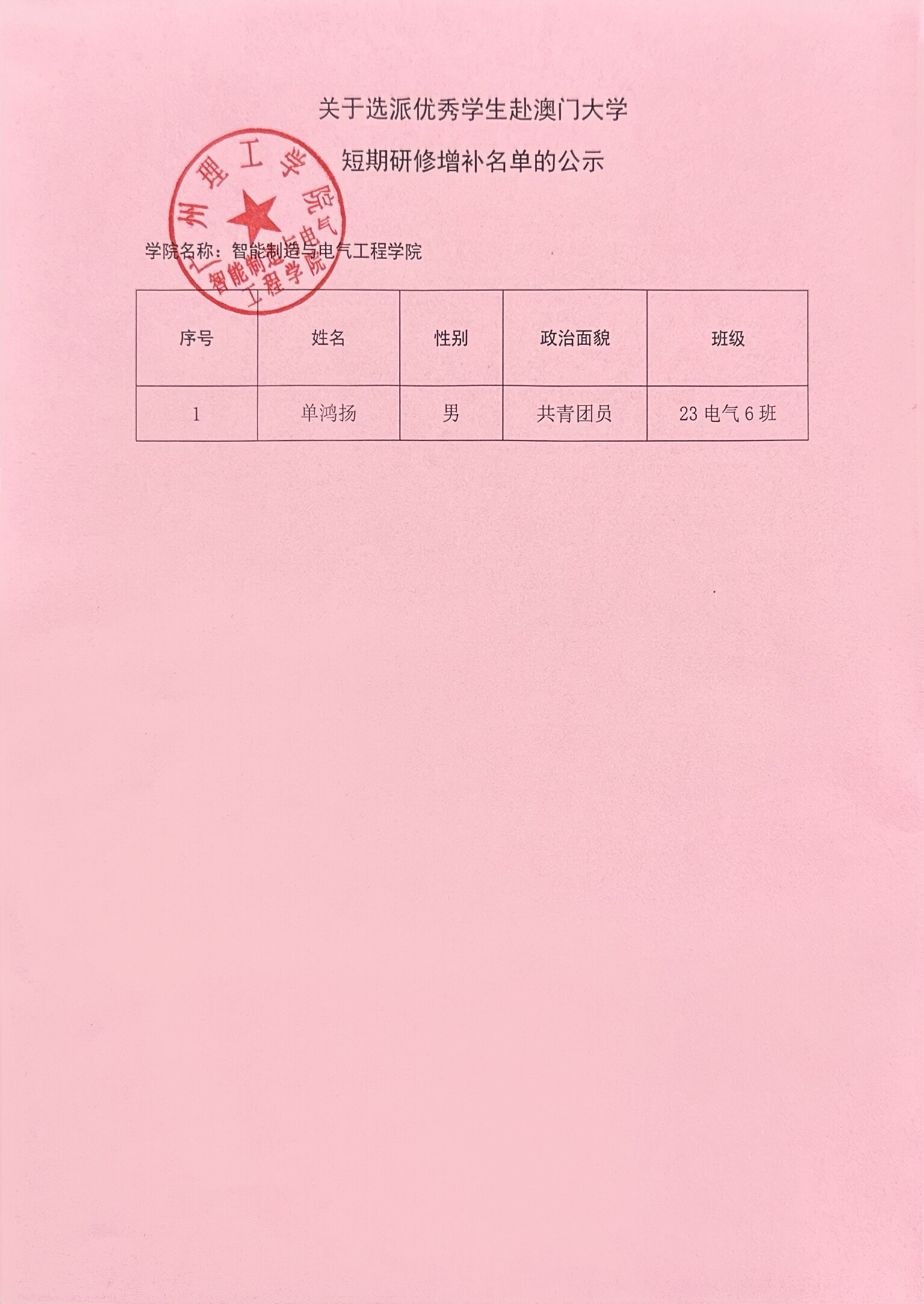 根据122cc太阳集成游戏 《关于选派优秀学生赴澳门大学短期研修的通知》有关要求,我院经上级部门名单分配,新增1名额,按选拔积分明细表排名,增补单鸿扬同学,现予以公示,具体如下: