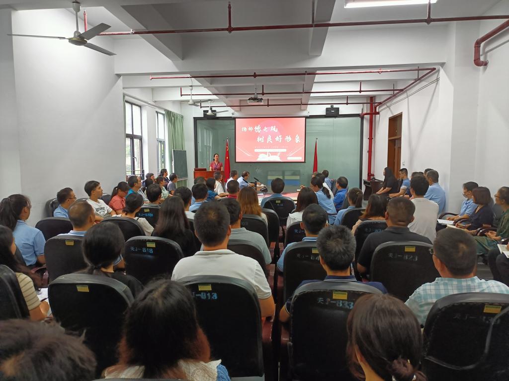 新入职教师代表庞姗老师发言,她表示作为一名新入职教师,将尽自己所能,以身作则,做一个品德高尚的榜样,对学生和同事负责;将坚守教育的原则,诚实、公正、公平地对待每一位学生;严格遵守教育规章制度,不论是学校的规定还是国家的法律法规;将遵守职业道德规范,维护教师职业的尊严和荣誉。