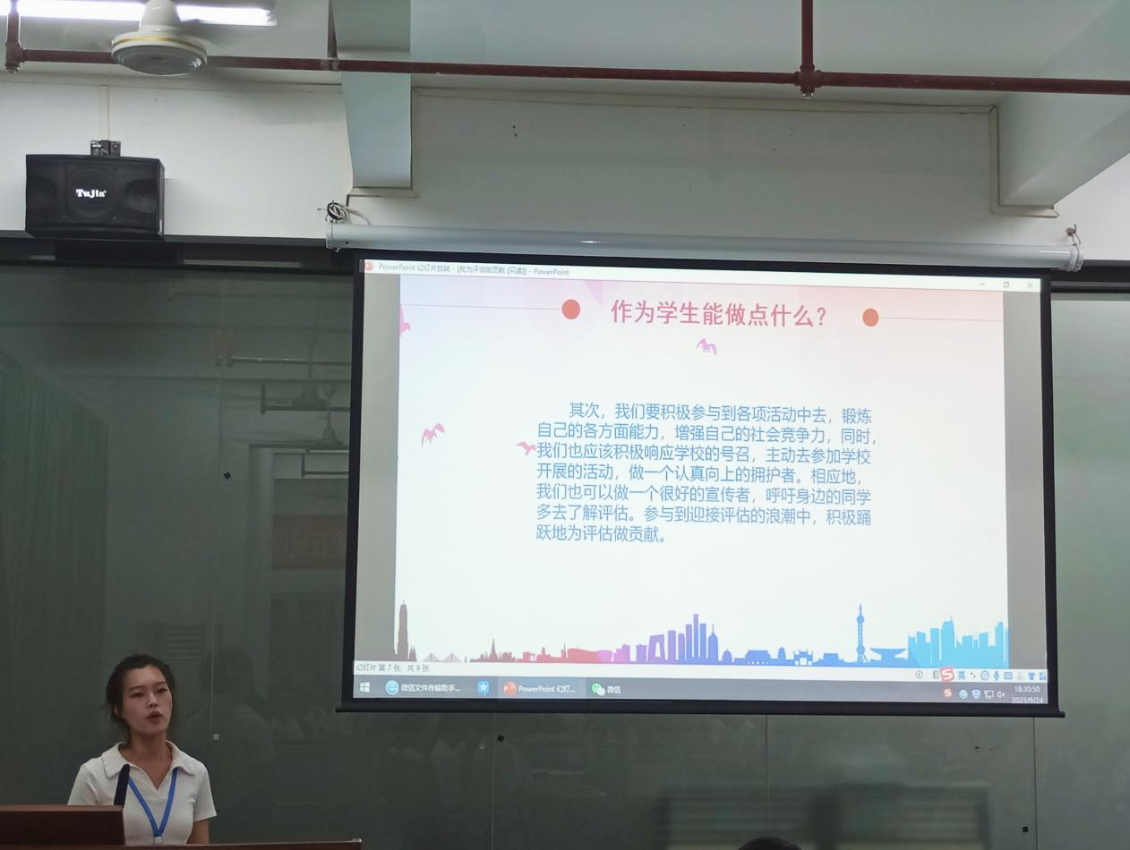 辅导员刘紫云老师进行讲解,她强调,在本科教学工作合格评估中,广大在校生扮演着极为重要的角色。她鼓励大家树立起校兴我兴,校荣我荣的主人翁意识,并呼吁大家积极主动地关注、参与和宣传评估工作,维护学校良好的形象。此外,她还强调了正确参与评教、端正学习态度,严肃考风考纪,树立良好学风的重要性。她希望大家认真学习迎评知识,了解评估的相关要求,并展现出当代大学生的礼仪风范,做到文明、礼貌、大方。