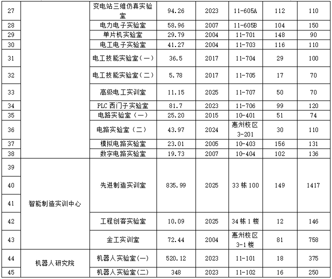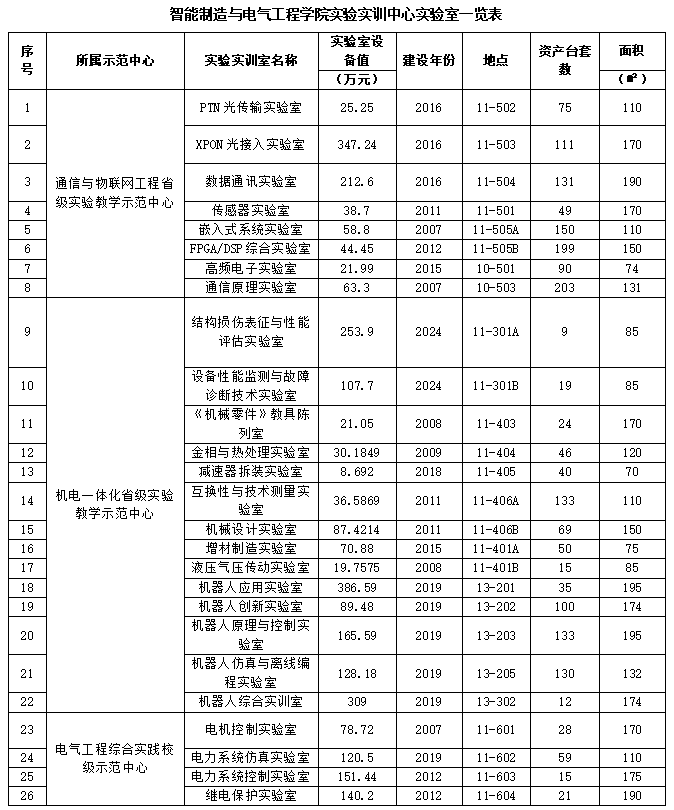 122cc太阳集成游戏实验实训中心现有2个省级实验教学示范中心、1个校级综合实践示范中心、智能制造实训中心以及人工智能与机器人研究院实验室,共有实验室45间,实验室面积7700多㎡,教学科研仪器设备总值5000余万元,为智能制造工程、电气工程及其自动化、机械设计制造及其自动化、机器人工程、自动化、电子信息工程、通信工程7个本科专业的教学和科研提供有力支撑。全学年接纳实验26697人次,达5528实验学时。学院成立有实验实训中心,负责实验室的建设与日常管理。实验室的所属及分布见一览表。